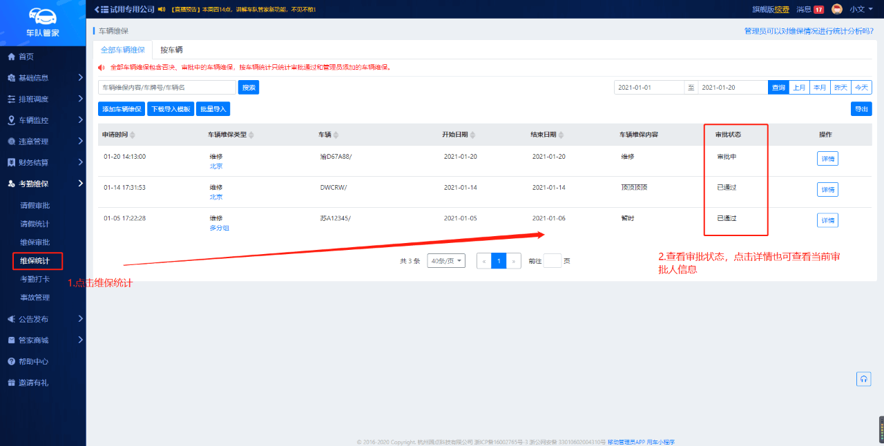 维保统计路径:管理员网页端--考勤维保--维保统计--详情