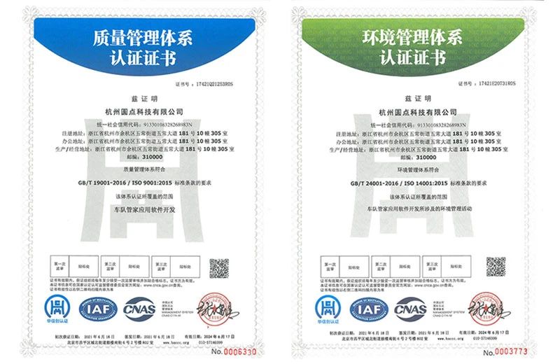 重磅!杭州圆点科技有限公司(即车队管家)已顺利取得国家权威认证机构授予的ISO9001、ISO4001两大管理体系认证证书。