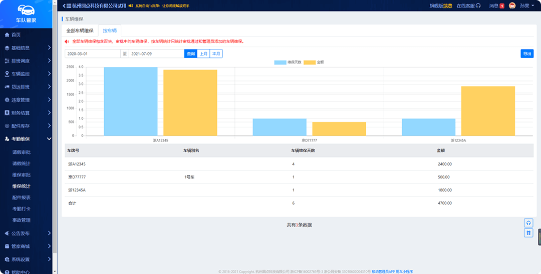 同时维修项目支持线上管理,系统实时记录维修次数,有效反映车辆维护保养频率,便于分析各车辆使用寿命,合理编排车辆的维护计划。