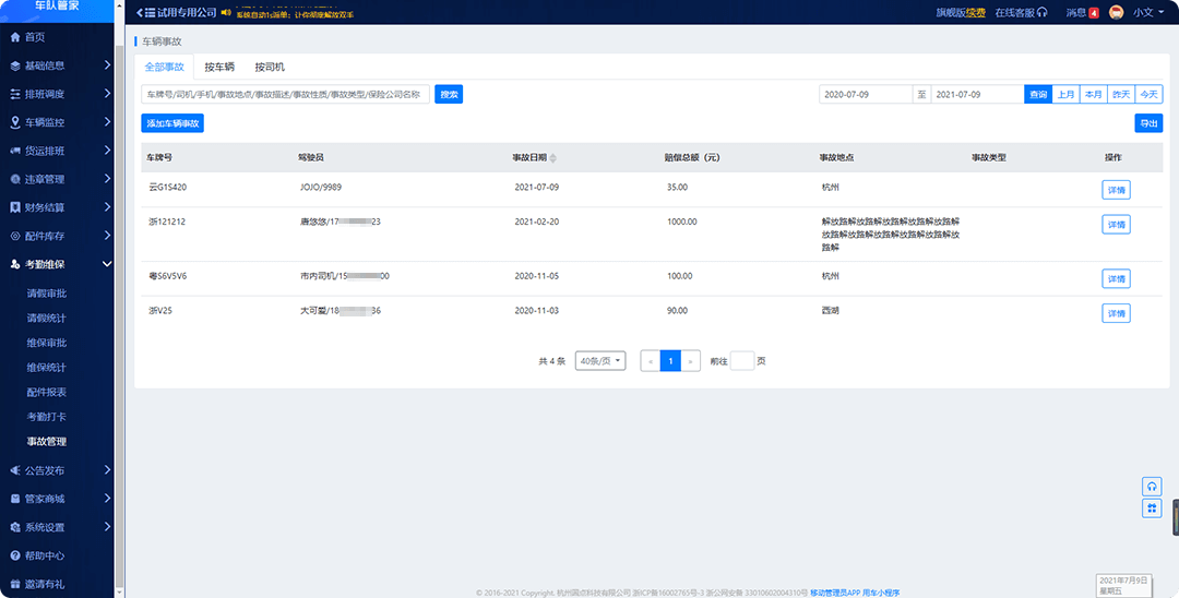 车辆事故管理可记录车辆在运输过程中出现的事故,统计损失的金额,帮助用户进行车辆损失核算,同时加强后期安全培训或车辆维护。