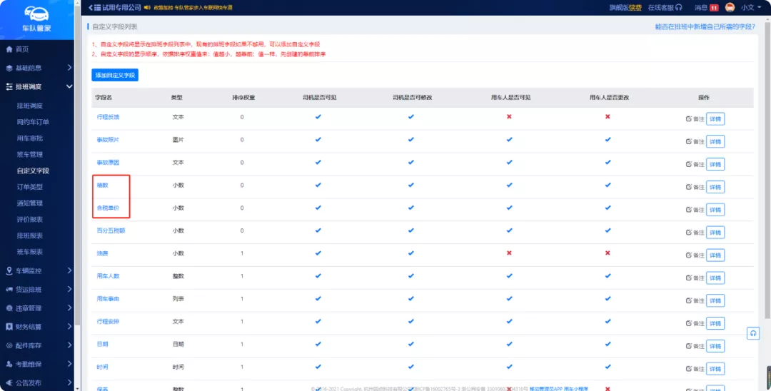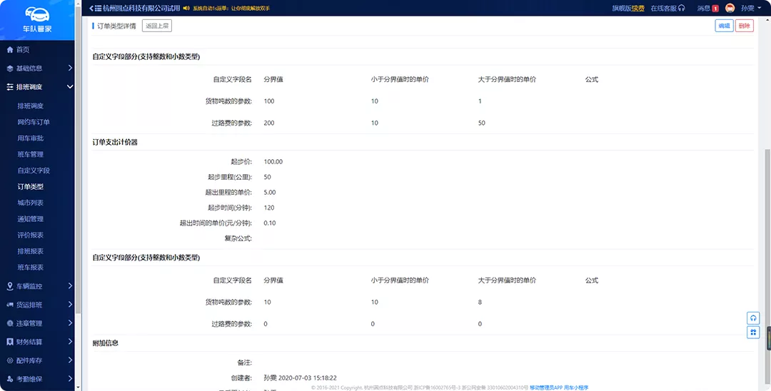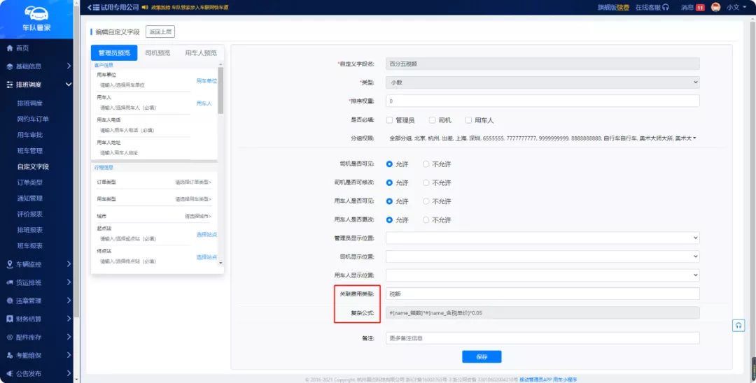 区别于『订单类型』,若您需要单独计算货品税费、总价等临时费用,您可提供相应的计费公式,车队管家会根据公式在后台配置字段。