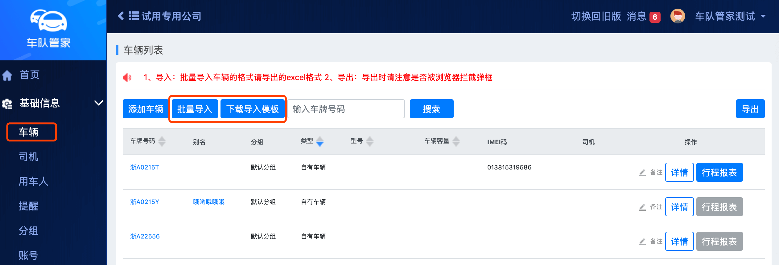 5、如何批量导入车辆信息? 1)登录网页端,先从车辆列表中导出一个车辆Excel表。 2)将车辆信息按导出的表格格式录入,其中车牌号、类型、状态为必填项,其他均为选填项,建议一次性将所有信息全部导入。 3)点击批量导入车辆,选择需导入的Excel表,将表格导入。